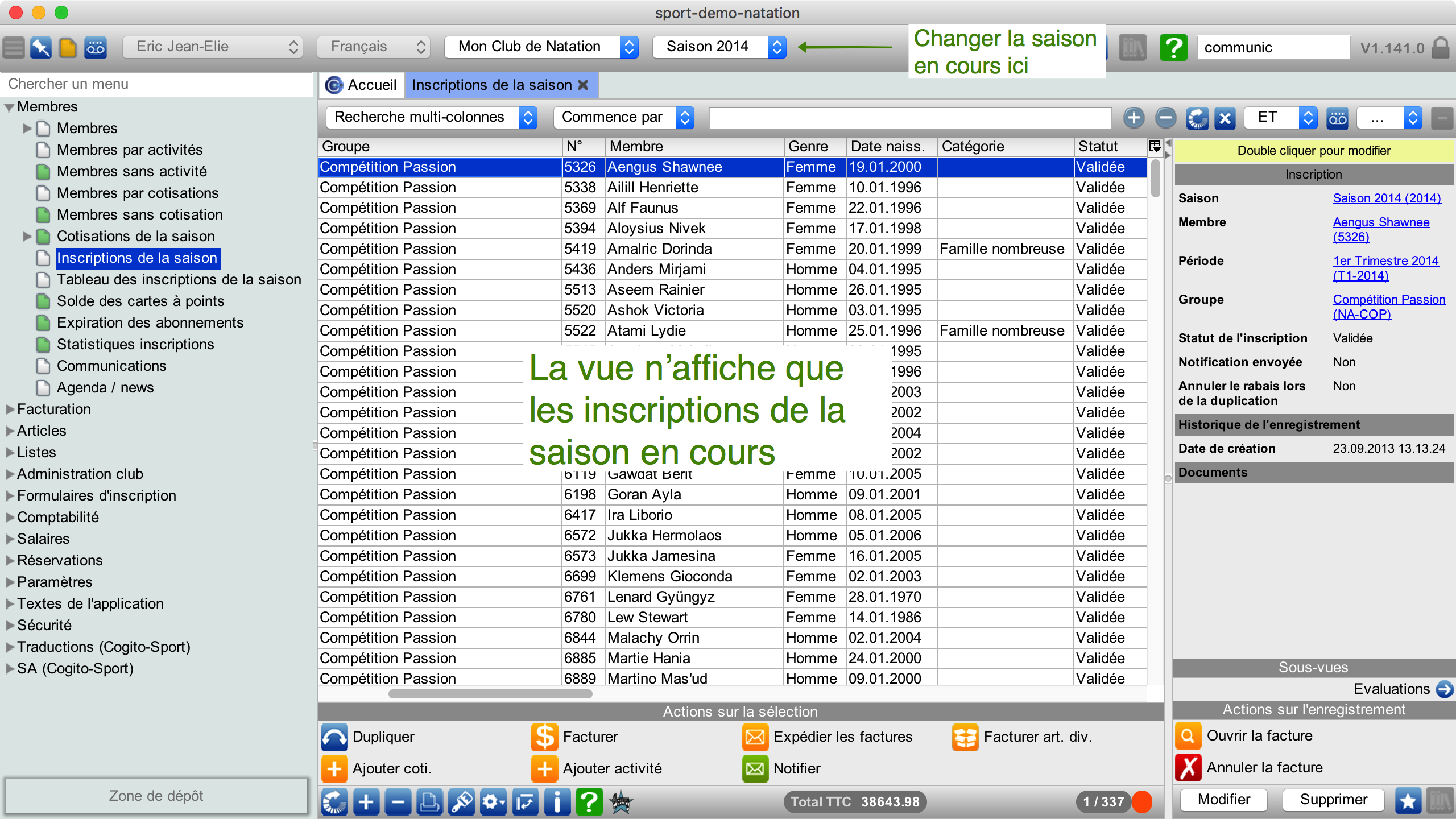 Si la saison en cours est 2016 le contenu de la vue Inscription de la saison ne montre que les inscriptions de la saison 2016