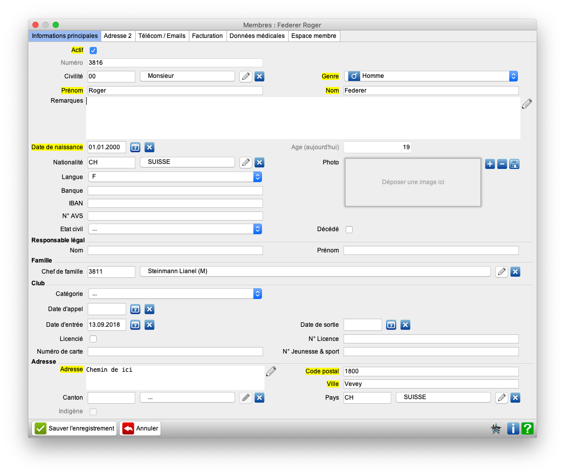 Exemple du premier onglet de la fiche membre (vue Membres -> Membres) :