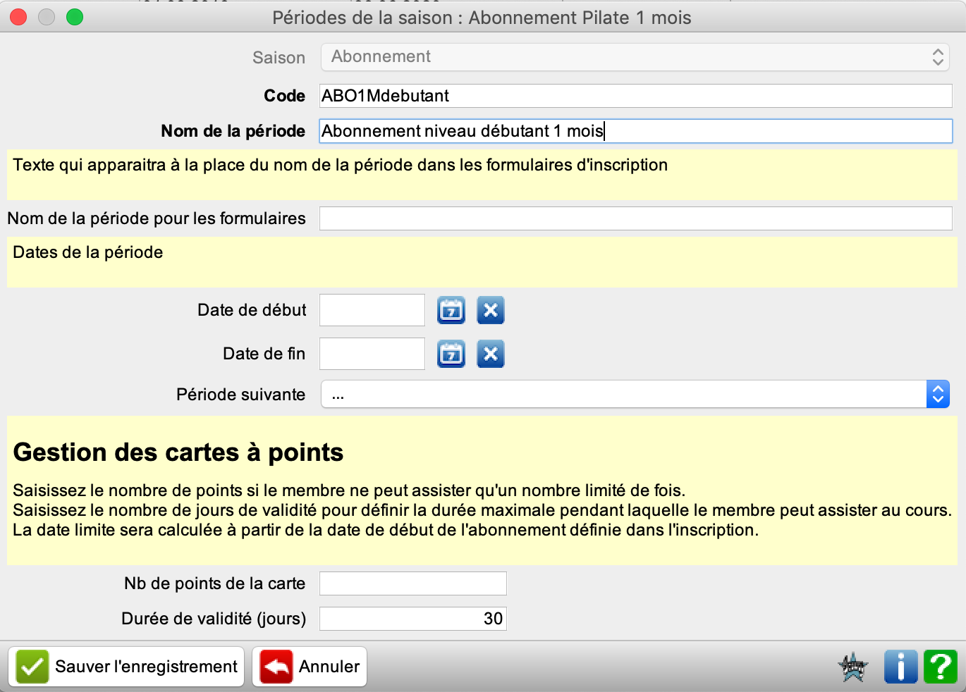 Pour la gestion des abonnements, il est possible de créer un seul cours et un seul groupe qui serait nommé "Accès salle" (par exemple) car le type d'abonnement peut-être défini dans la période (comme exemple spécifique).